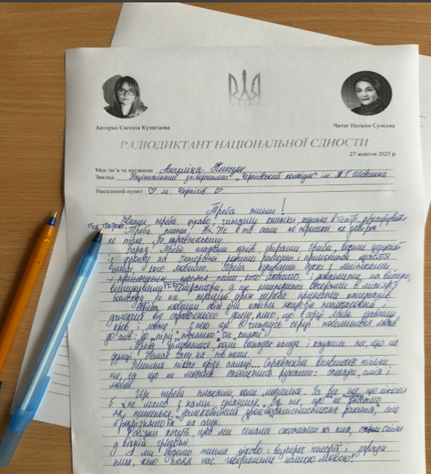 Магістрант-практикант Юлія Черненька: «Сьогодні тисячі сердець по всій Україні та за її межами билися в унісон, адже ми долучилися до Радіодиктанту національної єдності 2025! Від маленьких містечок до великих міст, від Львова до Харкова, від Києва до української діаспори в Канаді, Австралії чи Європі – усі ми взяли ручки й писали один текст, щоб сказати: наша мова – це сила, що об’єднує. Цьогорічний диктант – особливий, адже він 25-й за ліком, із 2000 року ця традиція стала символом єдності. Тема “Треба жити!”, створена письменницею Євгенією Кузнєцовою – це заклик до стійкості, надії й любові до життя. А голос Наталії Сумської, легенди українського театру й кіно, який начитував текст, наче обійняв кожного з нас, створивши неймовірну атмосферу. Чесно кажучи, деякі слова були справжнім випробуванням (ті коми, рідковживані терміни й підступні дефіси!). Але найголовніше – не ідеальна грамотність, а сам процес. Це момент, коли ти відчуваєш себе частиною великої спільноти. Писати диктант – це ніби разом із тисячами інших – школярами, студентами, письменниками, науковцями – творити щось більше, ніж текст. Це про єдність, про гордість за нашу мову, про відчуття, що ми разом пишемо історію. Кожен, хто сьогодні приєднався до Радіодиктанту, став частиною цієї унікальної традиції. Це не просто слова на папері, а спосіб сказати світові: “Ми тут, ми українці, і наша мова живе!” Дякуємо всім, хто писав разом із нами, чи то вдома, чи в офісі, чи навіть онлайн!»