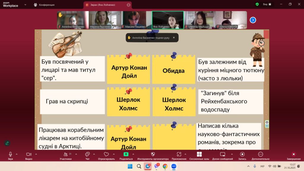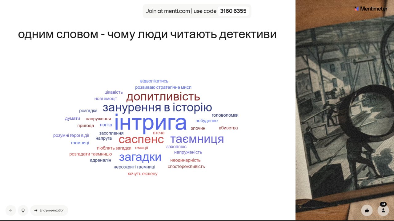 Засідання поєднало елементи дискусії, вікторини й творчого обговорення. Студенти презентували власні спостереження щодо розвитку жанру, поділилися улюбленими прикладами з художньої літератури як для дітей, так і для дорослих, і визначили, чому людство з прадавніх часів захоплюється і цінує гарні детективні історії.