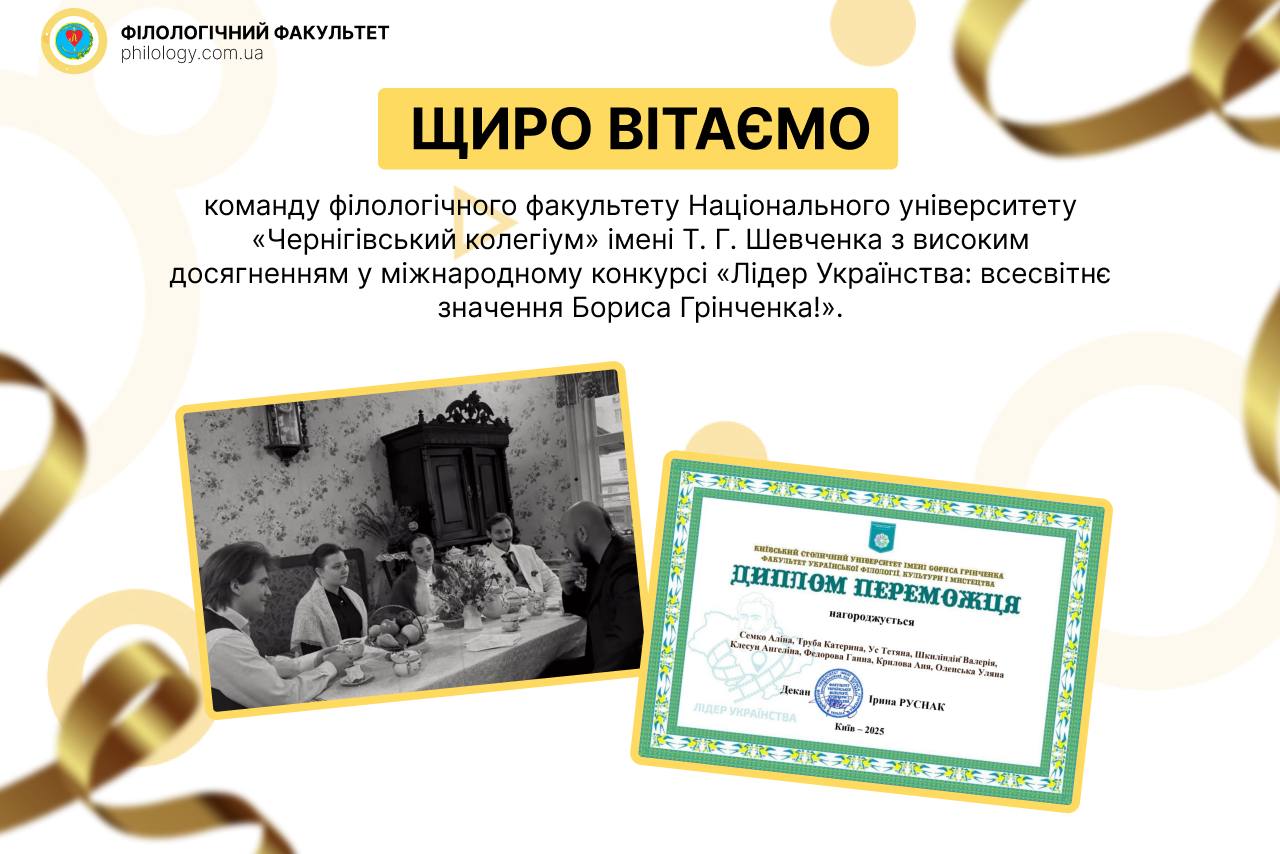 Щиро вітаємо команду філологічного факультету Національного університету «Чернігівський колегіум» імені Т. Г. Шевченка з високим досягненням у міжнародному конкурсі «Лідер Українства: всесвітнє значення Бориса Грінченка!».